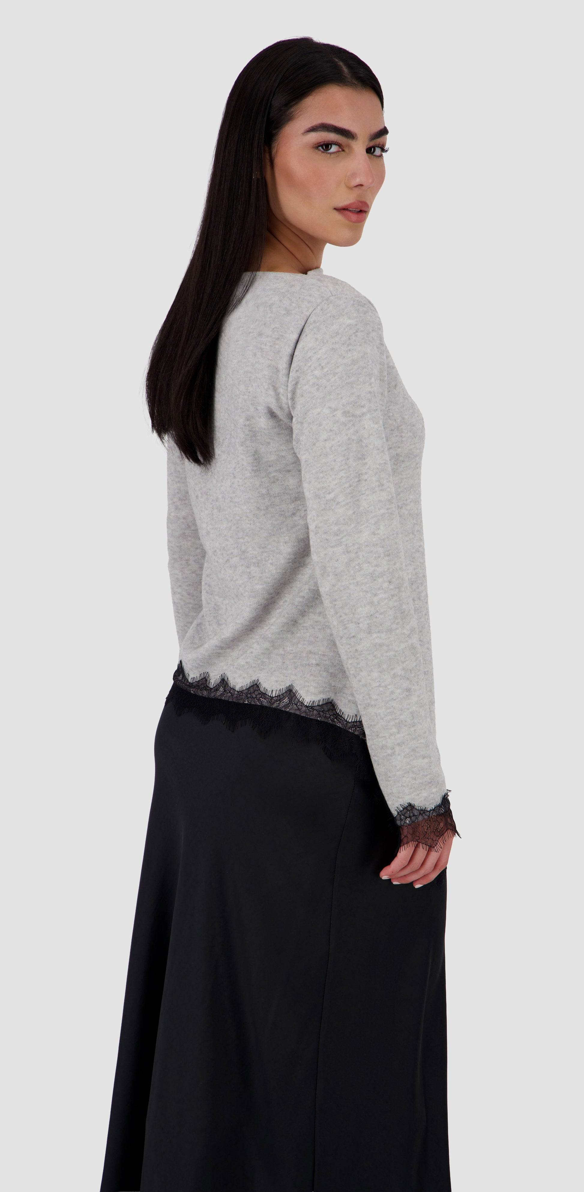 - Stretchy knit interlock wool fabric with black lace detail